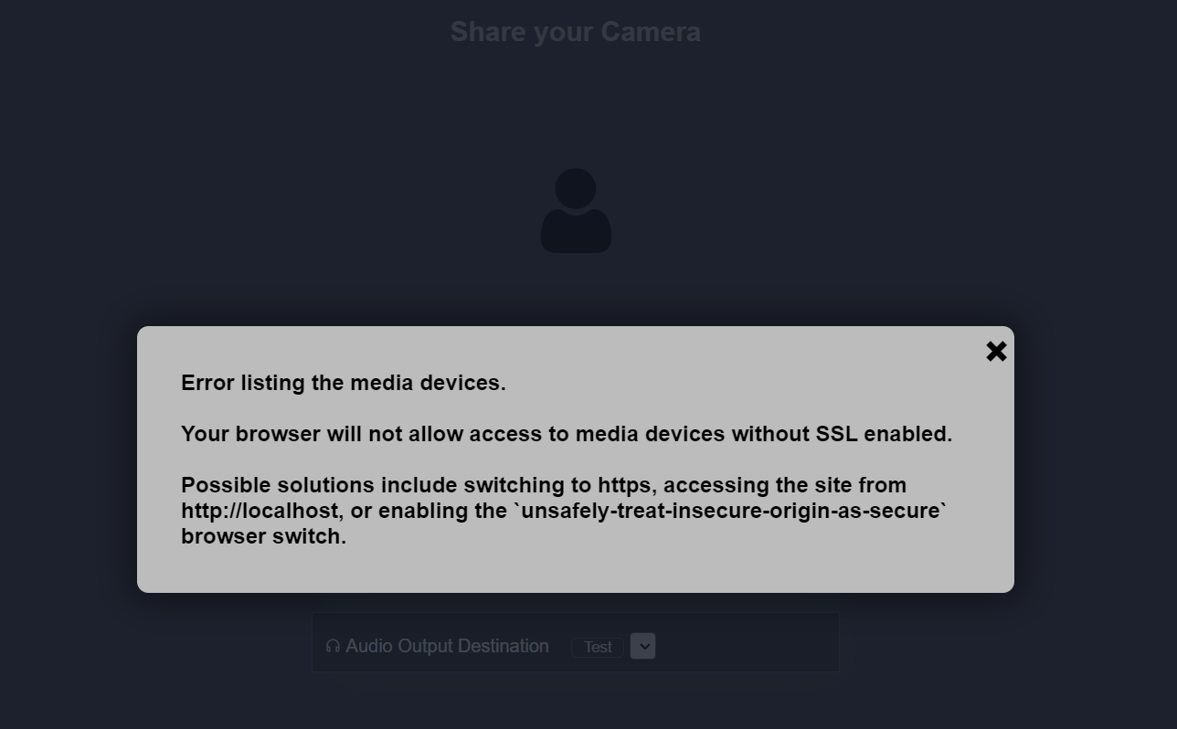 The Chrome / Edge / Chromium browsers will not allow access to media devices (camera / microphone) without SSL enabled.