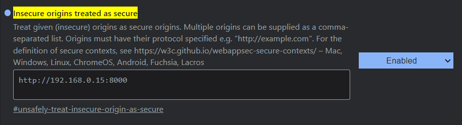 The browser flag, which works with Chromium-based browsers, can be accessed from: ***chrome://flags/#unsafely-treat-insecure-origin-as-secure.*** Specify the hostname and the IP address that you will be accessing, such as <https://192.168.1.15:8080>. Enable the option, and then restart the browser.