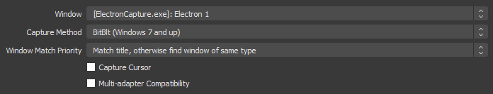You can use the Win+Tab key combo on Windows 10 machines to create a secondary desktop and load the Electron Capture into that. In this way, you can hide your electron capture windows, yet still have them be available to OBS for window-capture. This is a great option for window-capturing without on computers with limited desktop screen space.